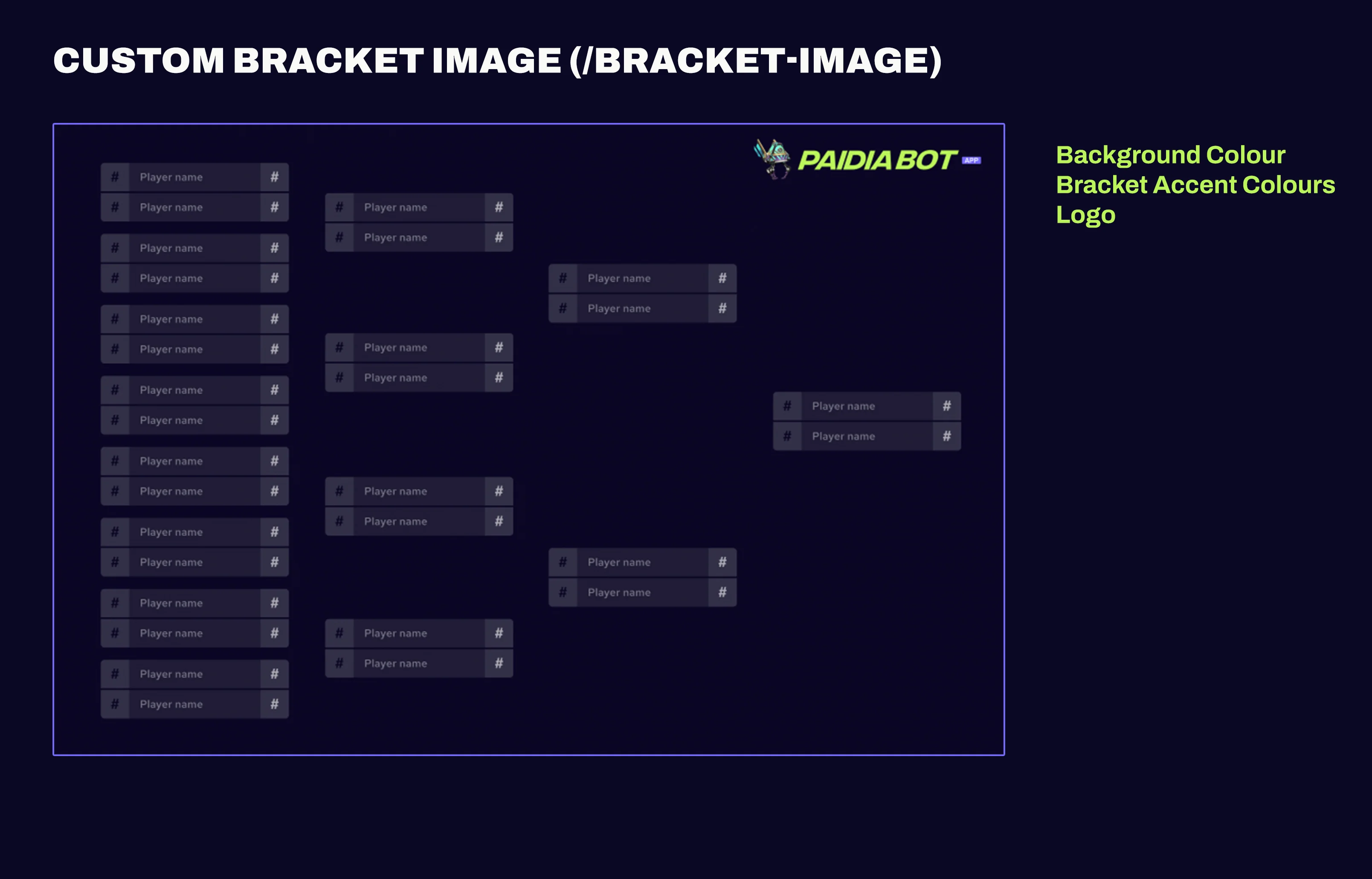 - Customize your /bracket-image command with your colors and logos. Note that this command will soon require our premium bot subscription*. Your tournaments will stand out with your branded bracket vs. Paidia Bot's standard display.
